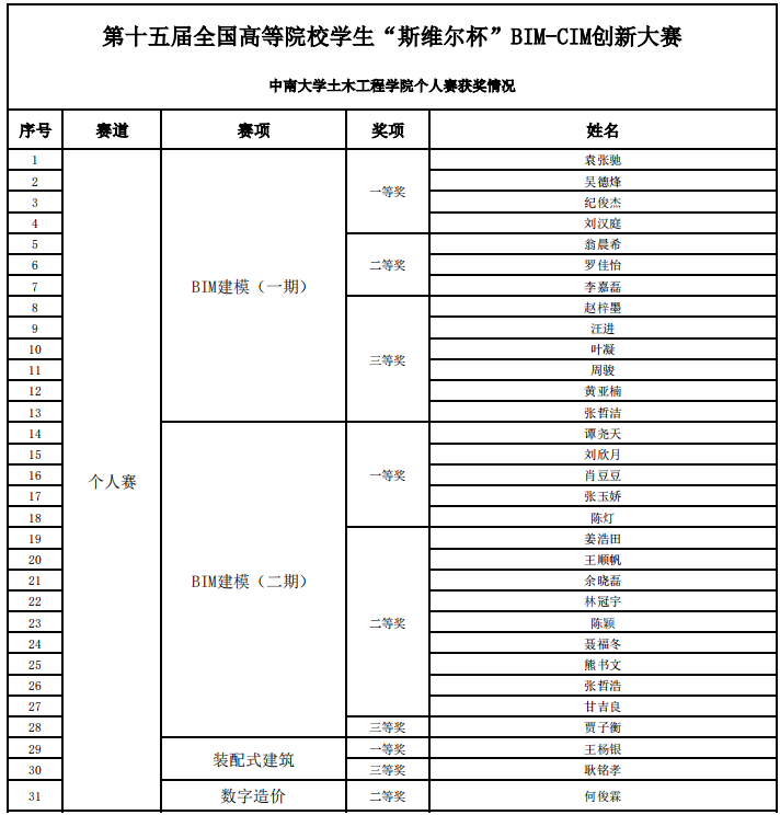 5月11-12日,第十五届全国高等院校学生“斯维尔杯”BIM-CIM创新大赛总决赛在湖南省长沙市举行,yl23411永利集团在团队赛中斩获本科组正向一体化BIM、CIM应用赛项冠军及一等奖2项,在个人赛中共获得一等奖10项、二等奖13项、三等奖8项。