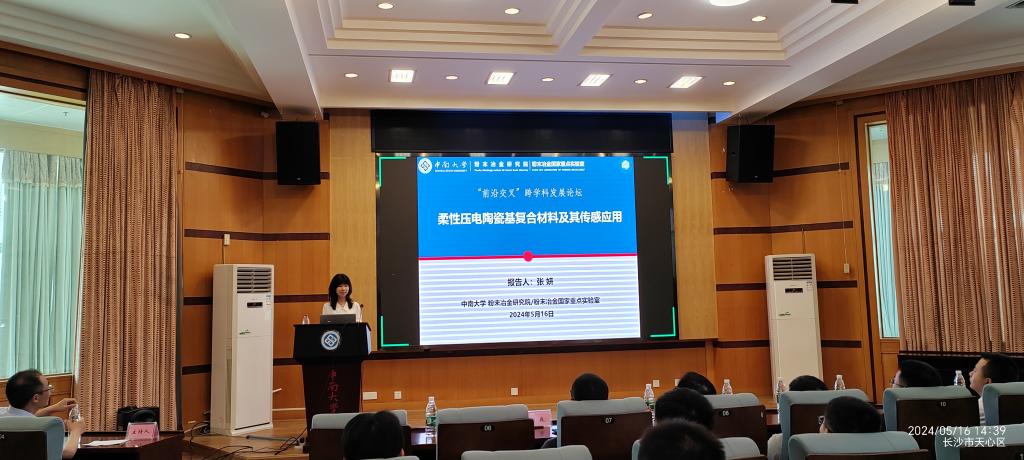 报告分为两场,在第一场报告中,张妍教授首先介绍了我校粉末冶金研究院的发展历程、科研平台、重大成果以及在我国材料领域战略新兴产业和自主创新做出的重大贡献。随后,张妍教授重点介绍了其在柔性压电陶瓷基复合材料及其在土木、交通、航天等领域的应用工作,柔性压电陶瓷基复合材料传感技术是典型的先进材料、物理传感、电子信息等多学科交叉技术问题。张妍教授阐述了研究高性能柔性压电材料的必要性,指出了突破柔性程度和电信号大小之间的对立关系是铁电陶瓷基复合材料目前存在的主要问题,介绍了在多孔压电陶瓷孔道结构优化及其复合材料的构型设计、高性能传感器件、自供电传感系统以及传感器在土木交通运用工作。