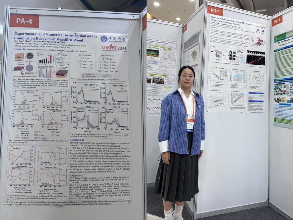 会议期间,yl23411永利消防工程系共展出4张海报,涵盖了固体火蔓延、致密木材的阻燃性能模拟、致密木材的开裂研究、火灾风险识别算法4个不同的主题,硕士生冯赛亚在场为国内外研究人员讲解展示。