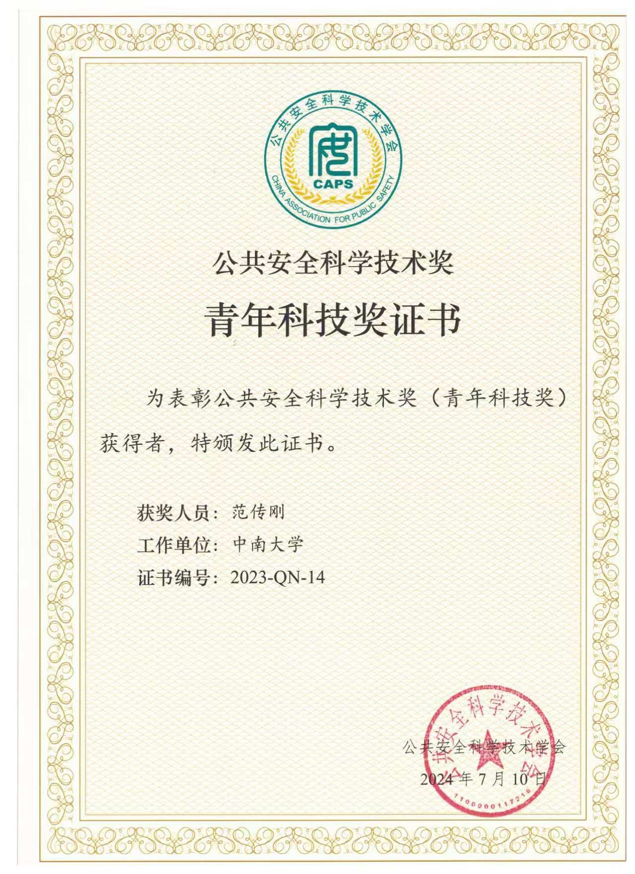 我院消防工程系范传刚教授获2023年度公共安全科学技术奖青年科技奖