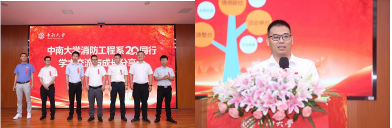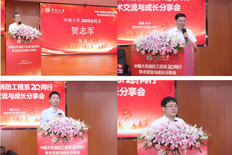 随后,校友代表发言交流。2005级校友、yl23411永利交通运输工程学院原党委书记贺志军,深情感谢徐志胜教授、赵望达教授等老一辈教师的付出,并引用“星星之火,可以燎原”“众人拾柴火焰高”表达对恩师们点燃学子求知之火、奠定事业根基的崇高敬意;2006级校友、消防工程系首位本硕博毕业生、2025年共青团中央新时代青年先锋奖获得者、中国安全生产科学研究院李建分享了个人科研及工作经历,重点介绍地铁火灾蔓延理论、控制技术及检测方法研究情况,坦言母校所学知识对工作助益颇深,并深情感谢了母校和恩师;2004级校友、福州大学张冬副教授分享了个人成长经历及在福州大学的工作情况,勉励在校学子珍惜时光、精进专业、投身实践,为未来发展夯实基础;2003级校友、中联科锐消防有限公司总经理倪天晓介绍了公司情况,高度赞扬了yl23411永利浓厚的创业氛围,并分享了自己创业历程;2010级校友、中建八局浙江建设有限公司第三分公司总经理徐骏峰通过线上方式介绍了中建八局发展历程与现状,并向校友们致以诚挚祝福。