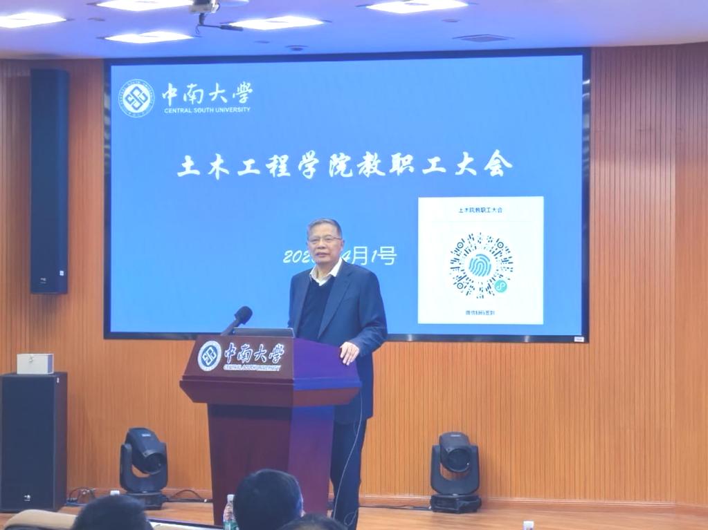 会议伊始,中国工程院院士余志武教授讲话。余院士结合自身深耕土木工程领域数十载的科研与育人历程,向全体教职工提出三点殷切期待:一是要永葆创新精神,主动拥抱科技变革,勇于突破传统思维定式,在前沿理论、关键技术领域敢为人先、追求卓越。二是要常怀危机感,清醒认识当前行业发展的严峻态势,摒弃懈怠心态,以时不我待、只争朝夕的紧迫感深耕本职、精进不休。三是要勇担使命,将个人发展与学院事业、国家战略紧密结合,深刻把握“十五五”规划纲要的核心要义,瞄准国家重大需求,为培养一流人才、攻克“卡脖子”技术、服务交通强国建设贡献土木智慧与力量。