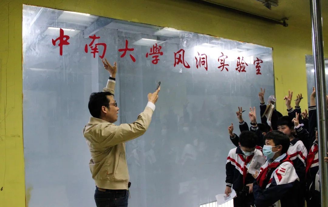 随后,同学们和老师一起在风洞高速试验段进行“吹风试验”。这次的“试验模型”可不简单,是一群可爱的小朋友,大家汇聚在一起准备迎接不同风速的挑战。随着风速的增大,队旗开始迎风飘扬,头发随风飞舞,前排同学也调整了抗风姿态。