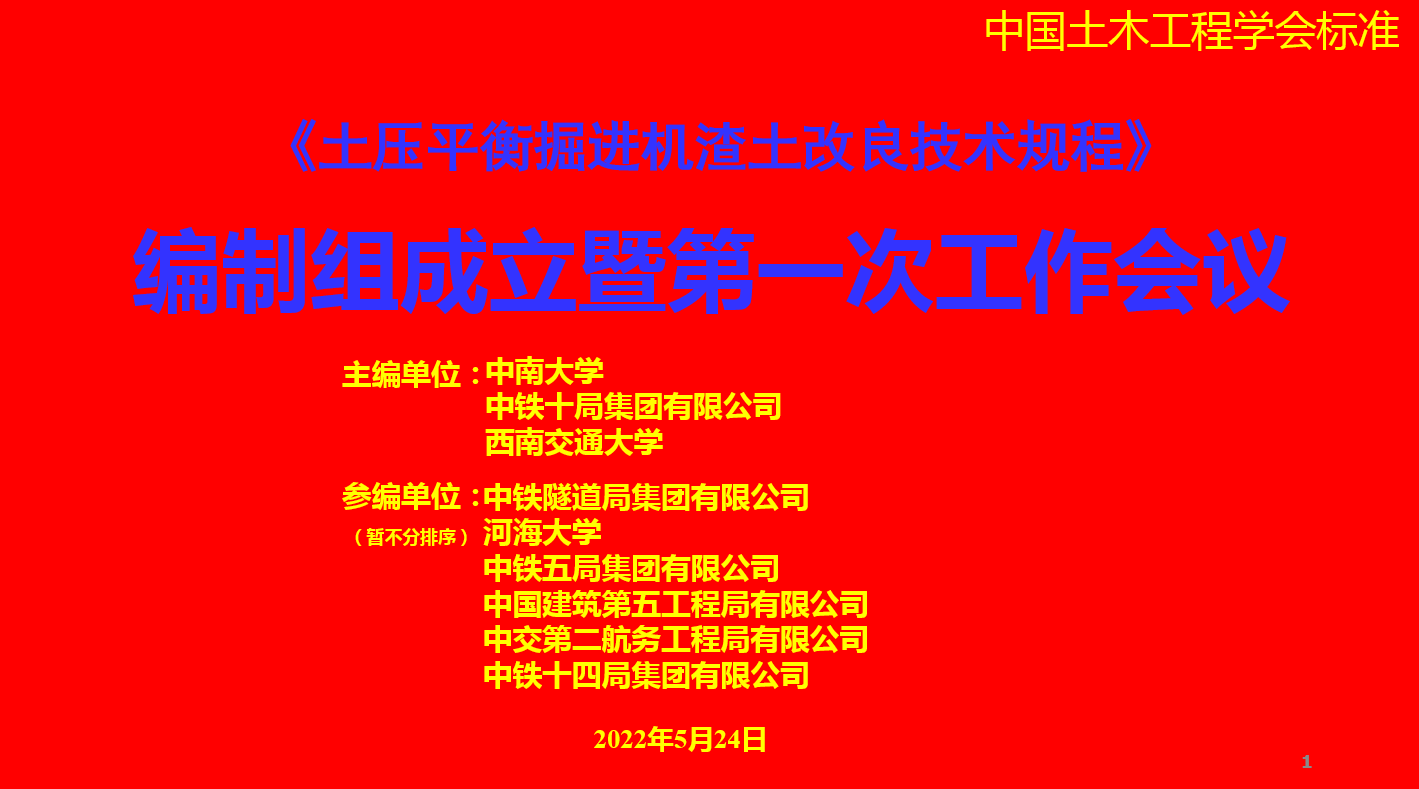 为了将科研成果进一步转化为生产力,王树英教授科研团队2021年8月向中国土木工程学会学术与标准工作委员会提交《土压平衡掘进机渣土改良技术规程》标准编制申请,2021年12年通过答辩立项,编制单位包括中铁十局集团有限公司、西南交通大学、中铁隧道局集团有限公司、河海大学、中铁五局集团有限公司、中国建筑第五工程局有限公司、中交第二航务工程局有限公司、中铁十四局集团有限公司等施工企业与高等院校。这次标准编制组成立暨第一次工作会议的圆满召开为后续标准编制工作的顺利推进奠定了良好基础,将于2023年底完成标准编制和报批工作。