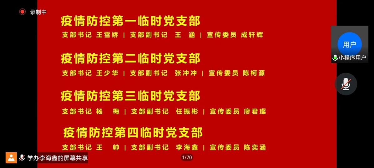 学院党委书记蒋琦玮表示本次疫情来势突然,对学院的工作是极大的考验,学院党委及时召开了党委会、党政联席会,组织部署各项疫情防控工作。对疫情防控临时党支部的同志们提出了三点要求,一是在关键时刻,党员要发挥先锋模范作用,临时党支部要发挥好战斗堡垒作用;二是党员要发挥骨干作用,处于封控管控区域内的学生党员要按照学校的要求协助完成人员摸排、核酸检测,后勤保障等各项服务保障工作;三是协助同学们做好心理调适,以良好的心态面对疫情。疫情防控工作在全体师生党员的共同努力下一定会取得胜利。