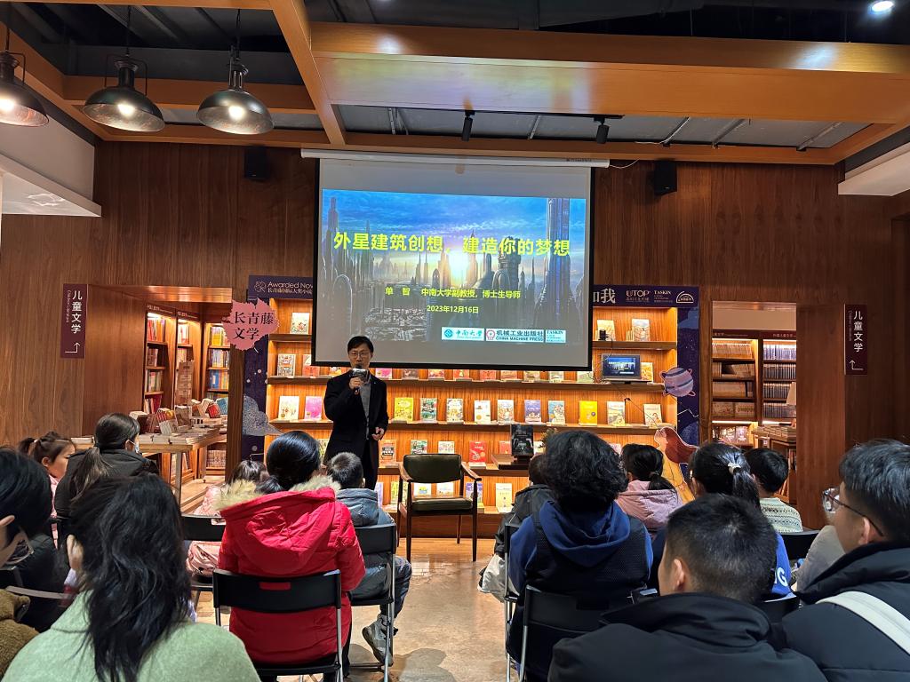 自2022年至2024年初,单老师与李老师在yl23411永利第二附属小学、湖南图书城和德思勤24小时书店等,围绕《科幻电影中的建筑》《太空建筑创想,建造你的梦想》《机器人和房子》等主题开展了多场科普讲座。在讲座中,两位老师生动形象地讲解了建筑艺术和建筑技术知识,探讨了未来人类在地下、外星、太空甚至虚拟世界等各种环境中的建筑审美、技术挑战以及可能解决方案,并采用多种互动形式让观众体验3D打印等新兴建造技术。该系列讲座主要受众为青少年,累计200人次参与。