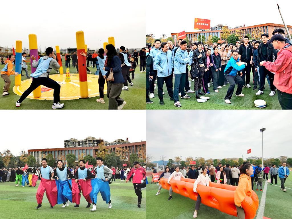 本次趣味运动会共设有“屹立不倒”“齐心协力”“快乐一起拼”“趣味飞盘”和“共赴未来”5个趣味团体运动项目,集竞技性、趣味性为一体,综合考验了教职工队伍的身体素质、战术技巧以及协作能力。比赛过程中,每一位运动员都积极参与,认真投入,整齐划一的步伐、飞速填满的拼图、精准投掷的飞盘、默契配合的接力,展示了我院教职工的活力风采和拼搏精神。未上场的教职工化身啦啦队为上阵队员加油鼓劲,笑声、欢呼声、呐喊声回荡在田径场上空。