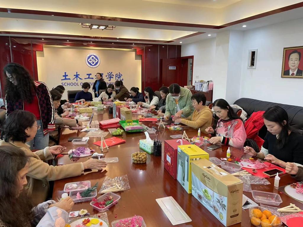 女工委员李奕提前准备好了制作材料和纪念品。团扇制作老师详细讲解了团扇制作的流程与技巧。随后,老师们纷纷开始动手用自己喜欢的花束和颜色装饰着团扇,大家一边制作一边热烈地讨论着自己理想的制作效果,现场洋溢着和谐、欢快、热闹的景象。