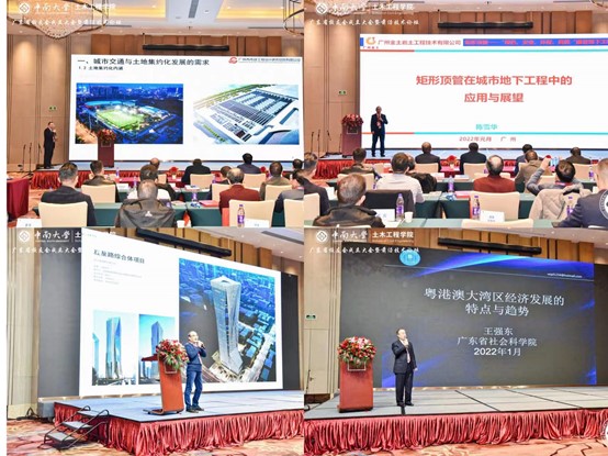 到场全体人员合影留念后进入前沿技术论坛。广州市政总院党委书记、董事长熊正元做了《城市交通与土地集约模式》的报告;广州金土岩石工程技术有限公司董事长陈雪华做了《矩形顶管在地下空间建设中的应用与展望》的报告;中都工程设计有限期公司总经理黄道沸做了《中都公司的发展与感想》的报告; 广东省社会科学院经济研究中心主任王强东做了《粤港澳大湾区发展形势》的报告。