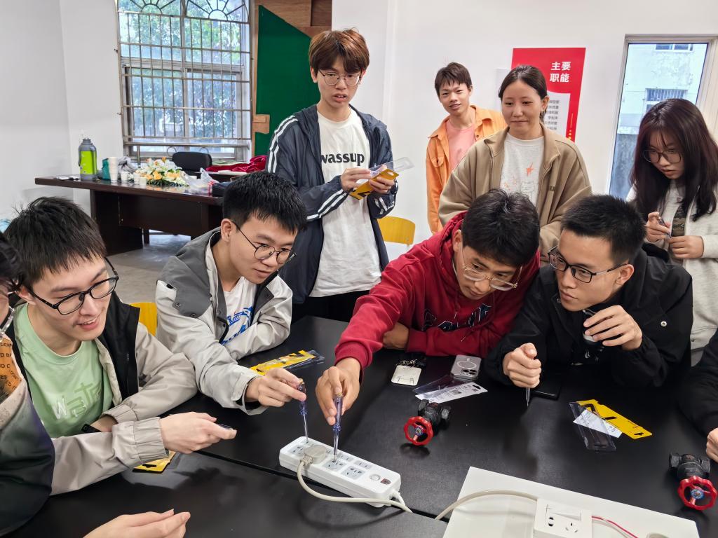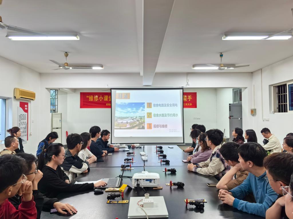 在校工作二十余年、维修经验丰富的水电师傅陈柏青进行授课和现场实操,他用特制的线路板,向同学们展示宿舍内线路控制的基本原理,结合生活中常见的水电问题,从“宿舍电路及安全用电”“宿舍水路及节约用水”“报修与维修”三个方面讲解水电小常识和报修流程,让同学们熟悉宿舍水电设施设备及故障应急处置方法。陈师傅还带领同学们,在保障安全的前提下,学习更换电灯泡、跳闸恢复等实用技巧,让大家能动手解决生活中出现的简单维修问题。