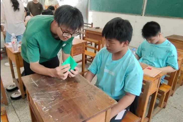 图为支教团成员胡康指导学生折百合花