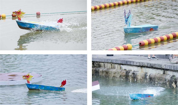 此外还需要在船上安装动力控制系统,选手们通过遥控龙舟的航行进行直线竞速赛和障碍行驶赛。