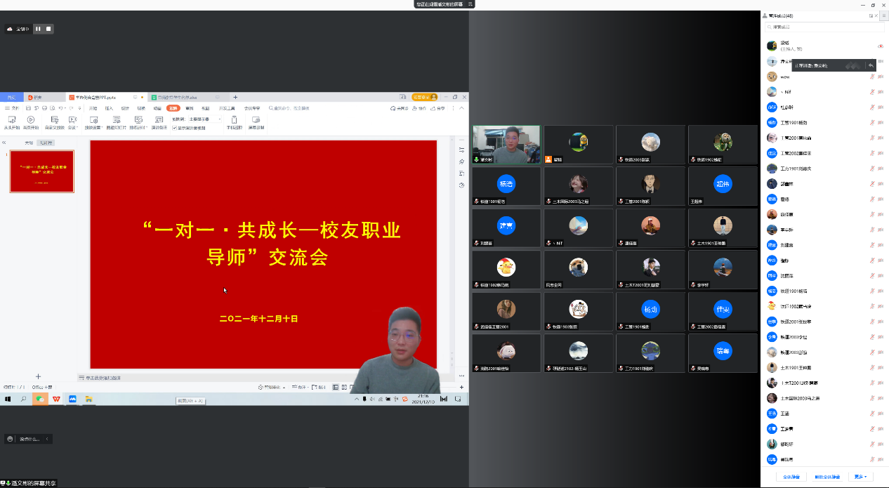 12月10日晚9点,由学院团委副书记潘文彬老师主持开展线上会议,为学生介绍了此次校友职业导师计划的工作安排及相关事项。本次活动从多家优质单位中择优选择了16位校友职业导师,通过yl23411永利集团研究生会发放报名通知,并为报名的46名同学按照志愿匹配了合适的导师。