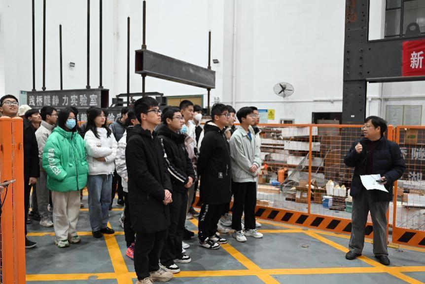 振动台实验室作为全国为数不多的大型振动台实验室之一,能够进行不同地震的精准模拟,房屋、桥梁等建筑物的抗震试验,引导学生认识到做好防护设计的必要性。风洞实验室中,老师通过风洞模型,向同学们讲解了风洞实验的原理和应用范围,带领大家体会风洞试验对工程设计的重要性。