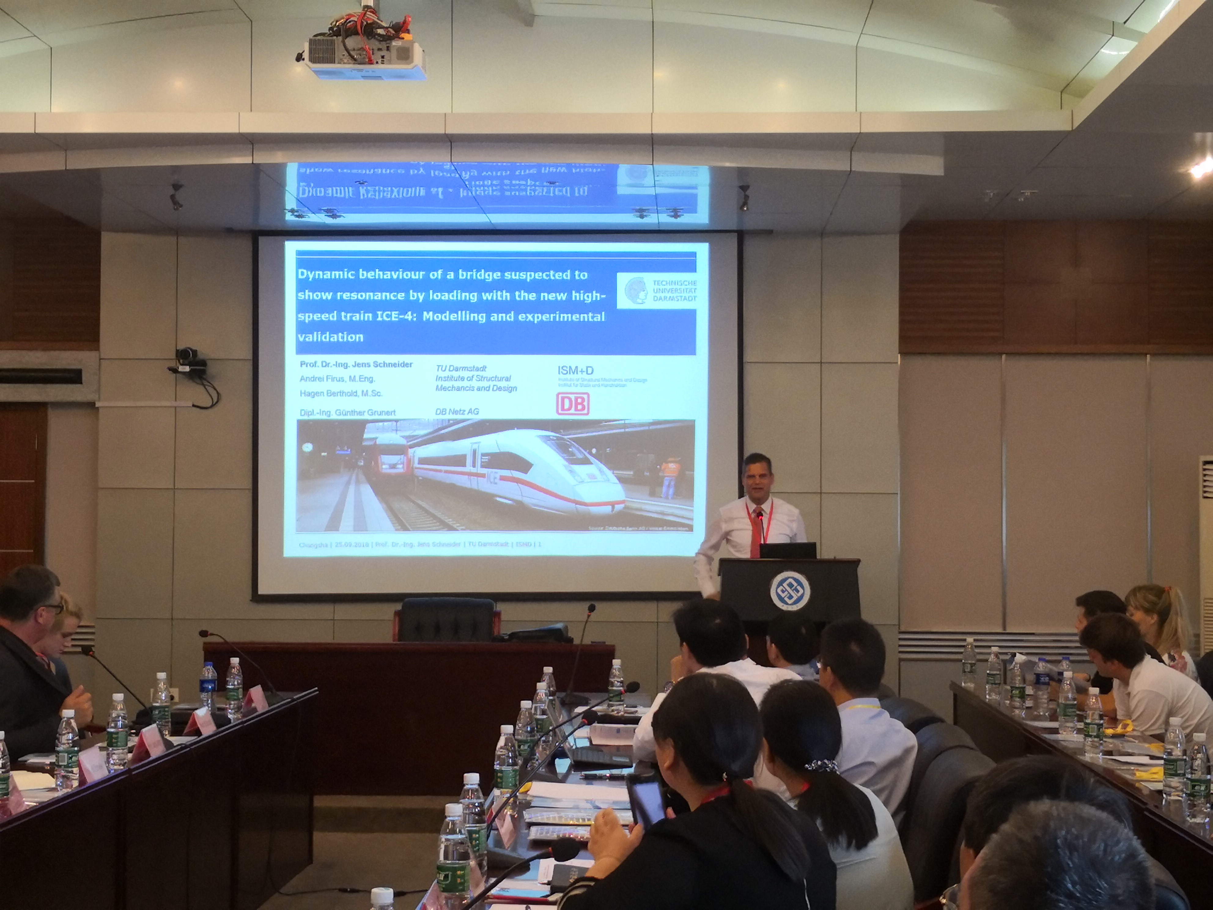 Jens Schneider 教授介绍了德国ICE-4列车作用下简支钢箱梁竖向共振特性研究。结合数值模拟与现场测试,发现有砟轨道非线性刚度特性对桥梁共振车速有较大影响。