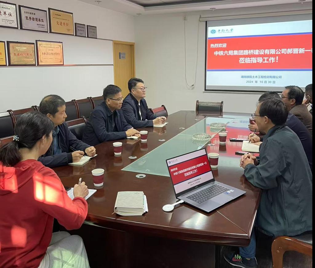 周德总经理代表公司对中铁六局路桥建设公司领导的来访表示热烈欢迎,并从公司发展历程、人员结构、检测场所、管理体系、工作业绩、校办企业的特色和公司愿景等7个方面介绍了公司的基本情况。随后,郝晋新总工程师也介绍中铁六局集团路桥建设有限公司基本情况,该公司是一家以市政、公路、桥梁工程为主,涵盖铁路、城轨等基础设施的综合性施工企业,郝总表示期待与湖南铁院土木工程检测有限公司在监控量测、材料检测以及检测智能化等方面开展实质性合作。双方管理人员还就检测、科研、新工艺、新方法等展开深入讨论,双方约定后期在检测业务、校企合作和科研等方面有更多合作。