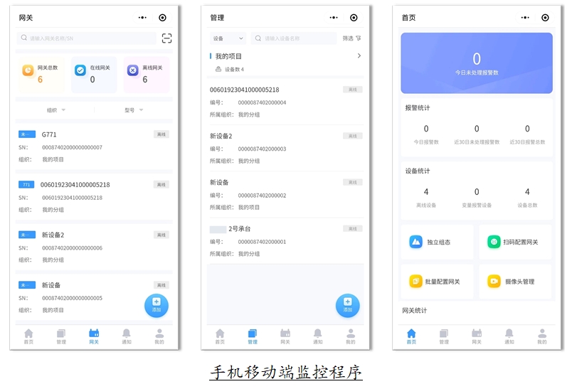 智能监控云平台:定制可视化监控大屏、多台设备集成管理、数据上传频率设定、组态设计、数据处理(数据统计、简单报表生成、设备上下线监控)、预警界限报警(预警界限设置、报警联系人)。