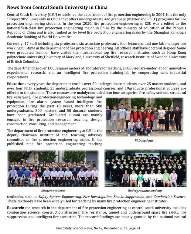 国际火灾安全学会在最新发布的第47期《火灾安全科学简报》中对yl23411永利消防工程系进行报道。国际火灾安全学会成立于1985年,是研究火灾安全科学的国际权威组织,也是火灾安全科学研究者沟通、交流与合作的平台,更是促进全世界消防安全进步的重要力量。《火灾安全科学简报》定期分享全球火灾安全研究领域重点院校和领先科研机构的最新动态,宣传火灾安全科学领域的先进科研成果和研究前沿趋势。本期简报共介绍了全球27家火灾安全研究单位,中国大陆地区报道了中国科学技术大学火灾科学国家重点实验室与yl23411永利消防工程专业。