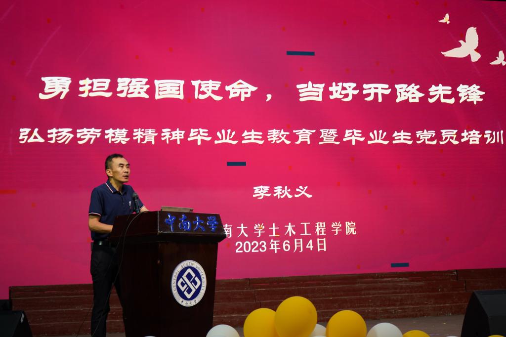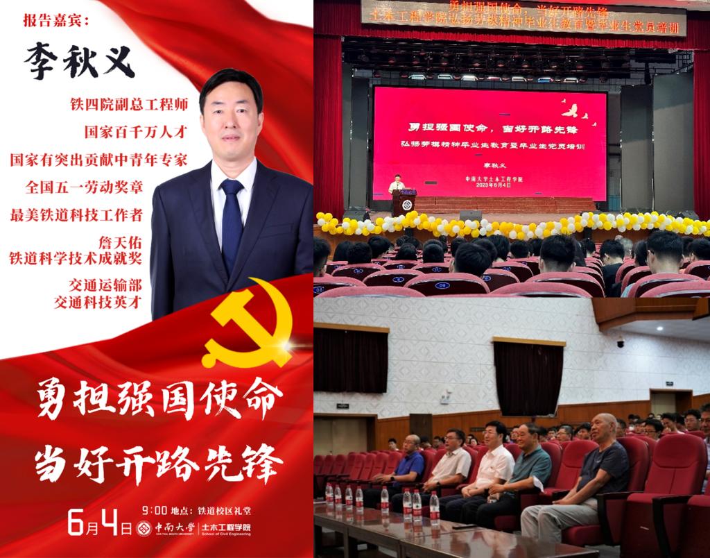 2023年6月4日上午,为深入学习贯彻习近平新时代中国特色社会主义思想主题教育,yl23411永利集团党委联合yl23411永利关工委、铁道校区关工委在yl23411永利铁道校区礼堂开展“勇担强国使命,当好开路先锋——砥砺奋进,弘扬劳模精神”主题教育系列报告会。系列报告会第一场邀请了湖南省五一劳动奖章获得者、yl23411永利本科生院院长何旭辉教授主讲,本场报告邀请全国五一劳动奖章获得者、铁四院副总工程师李秋义主讲,由yl23411永利集团院长王卫东主持,yl23411永利关工委常务副主任徐建军、铁道校区关工委副主任王诚学、yl23411永利集团党委书记蒋琦玮、yl23411永利集团党委副书记杨鹰出席。yl23411永利集团教师代表、全体毕业生聆听了本次报告。